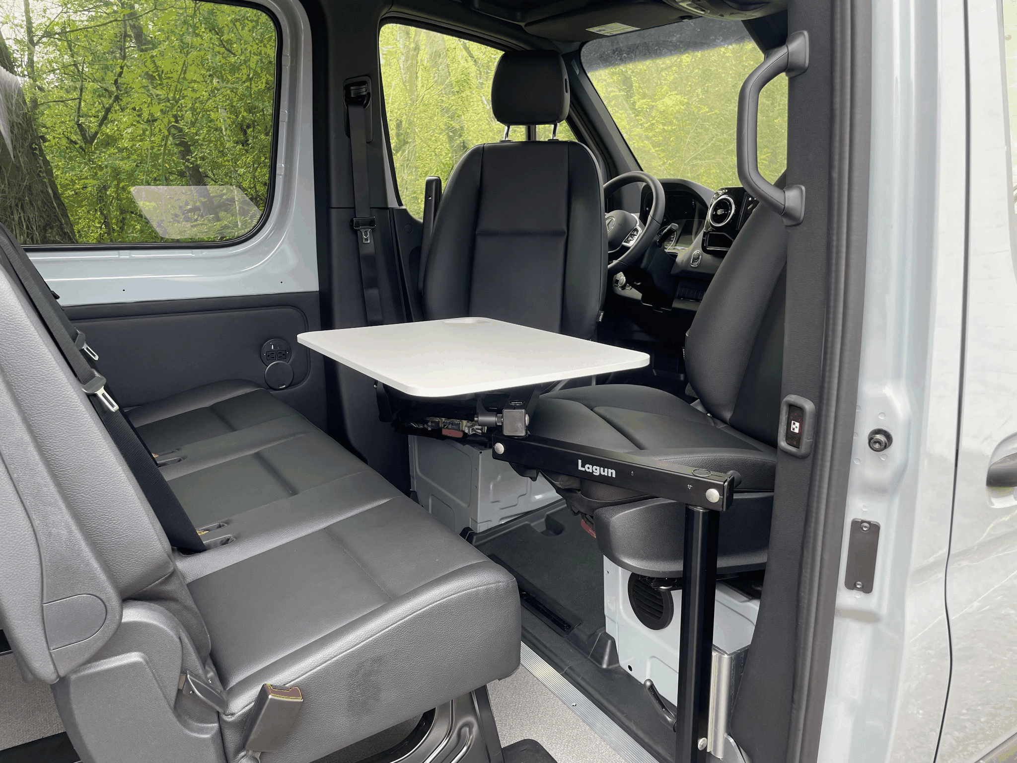 Convertible Lounge: Transform the cabin into a flexible lounge with ease. Premium driver and passenger seat swivels (FMVSS/CMVSS 207 & 210 certified) create a comfortable setup for dining, working, or relaxing. The dual-arm Lagun Table System adds convenience with an ergonomic surface that tilts, folds flat against the seat, or removes entirely to clear space when needed.