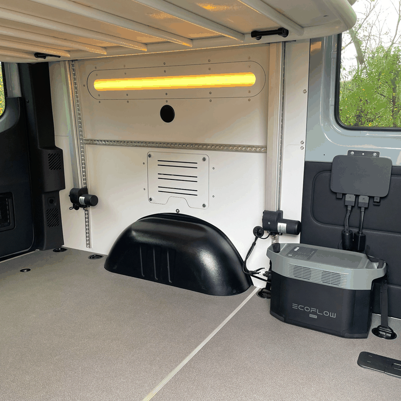 Power System: EcoFlow 800W Alternator Charger + Delta 2 Max Portable Power Station — a 3-in-1 fast DC-DC charger, battery maintainer, and jump starter. The system fast-charges while you drive and is easily removable for home charging or outdoor use. 110V and USB plugs are placed throughout the cabin, making it easy to power or charge your devices while you relax or work. Designed for efficiency, and flexibility, the setup delivers a capable and expandable power solution. Marine-grade wiring and connectors are used throughout the build to ensure reliability.